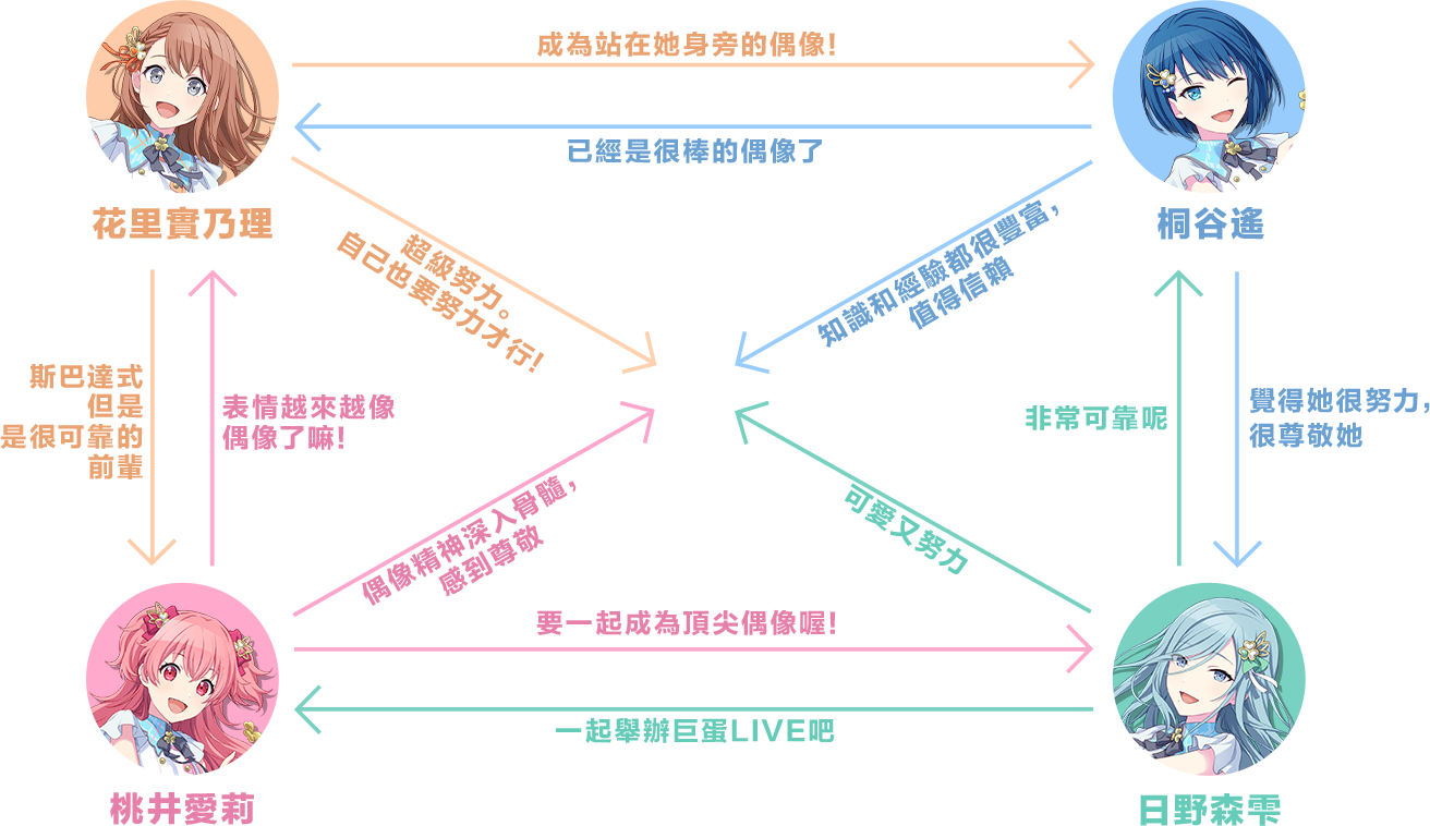 化身為偶像站上舞台, 充滿活力地唱歌跳舞。 同時以偶像的身分支持著四人。